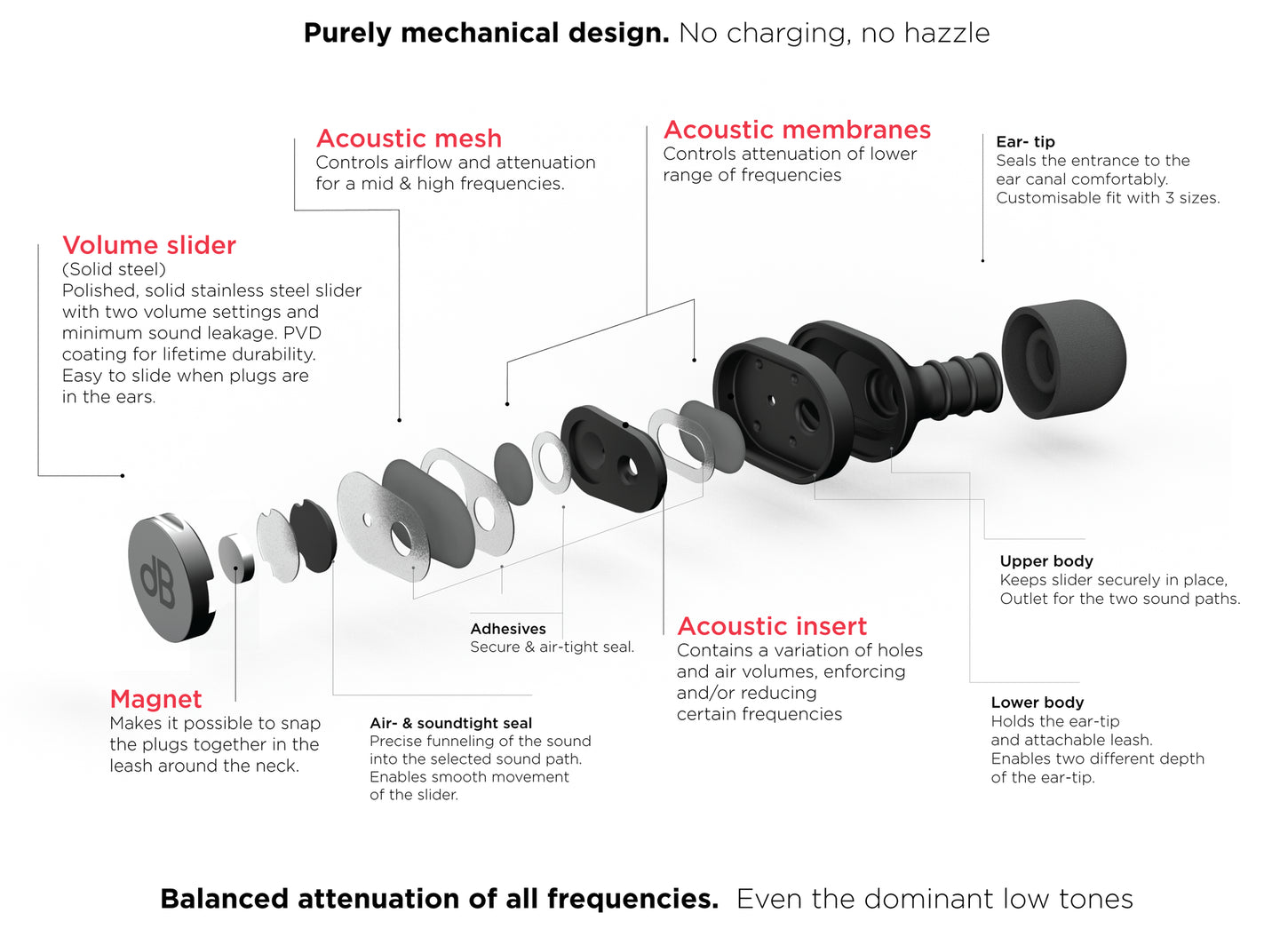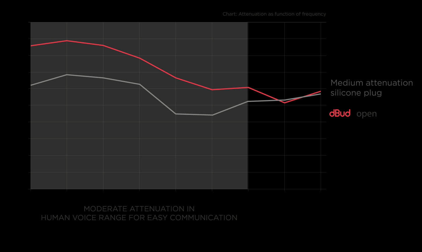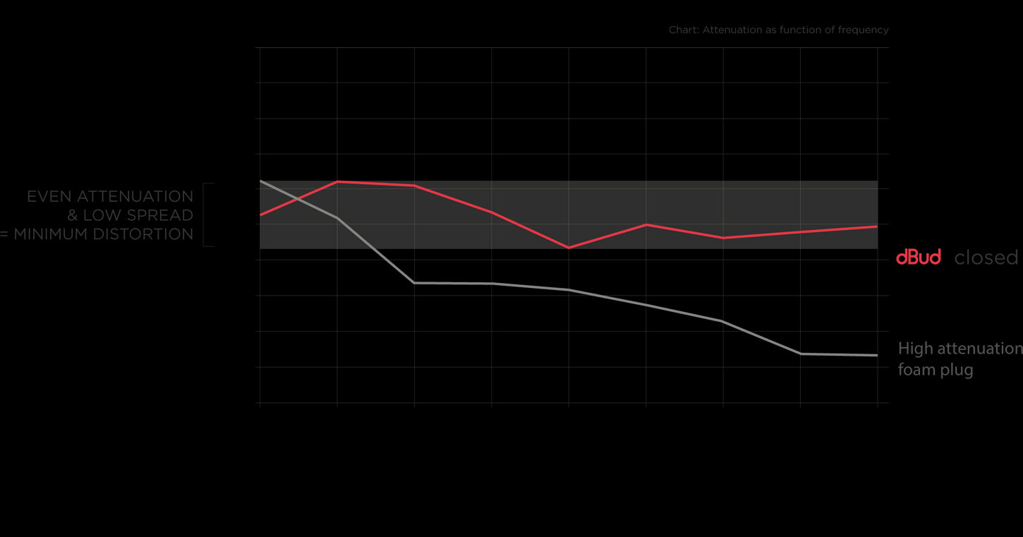 The usual problem with earplugs is that they kill both the volume and the sound. Uneven attenuation across high and low tones leads to a muffled and distorted sound. dBud is different. The closed setting has a very flat attenuation of around 30dB across the entire frequency spectrum. This means less distortion of the sound coming through to your ear, and it gives you the clearest possible sound experience, with significantly reduced volume.